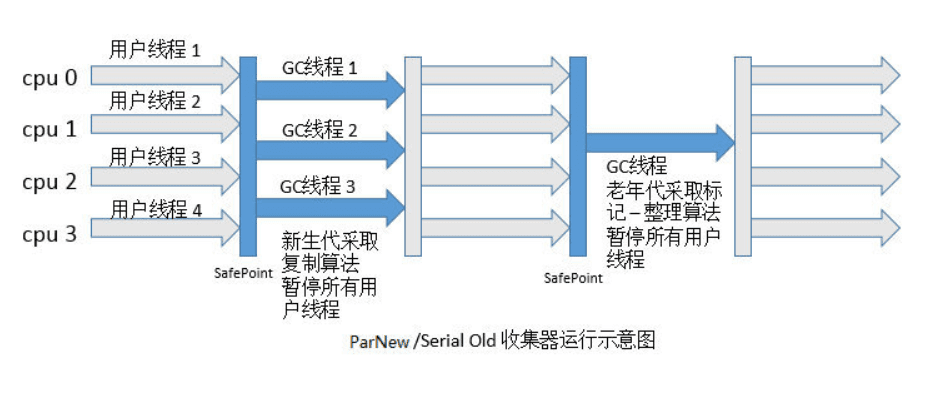 • Serial Old,用于老生代,采用标记-整理标记整理算法,回收时采用单线程的方式。进行垃圾收集的时候需要暂停其他线程(STW)。